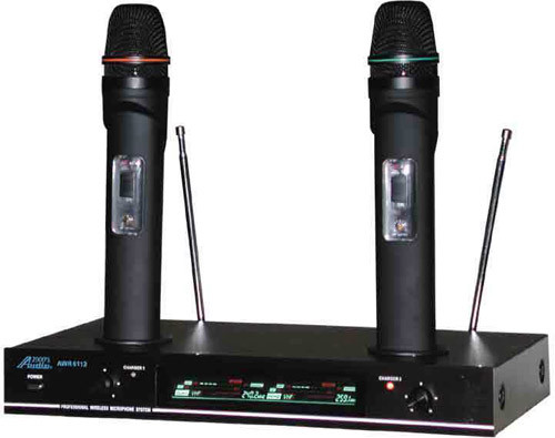 The Audio2000'S AWM6112 Plug-In-N-Recharge VHF dual channel wireless microphone system is a wireless microphone system with the recharge mechanism right on the top of the receiver (AWR6112) and on the microphone (AWX6112). Intended to be a solution provider for various application environment. The Plug-In-N-Recharge feature, with the recharge mechanism built right on the microphone and the receiver, makes the wireless microphone systems ready to be used at any time. A rack-mount kit is included such that the AWM6112 is rack mountable.