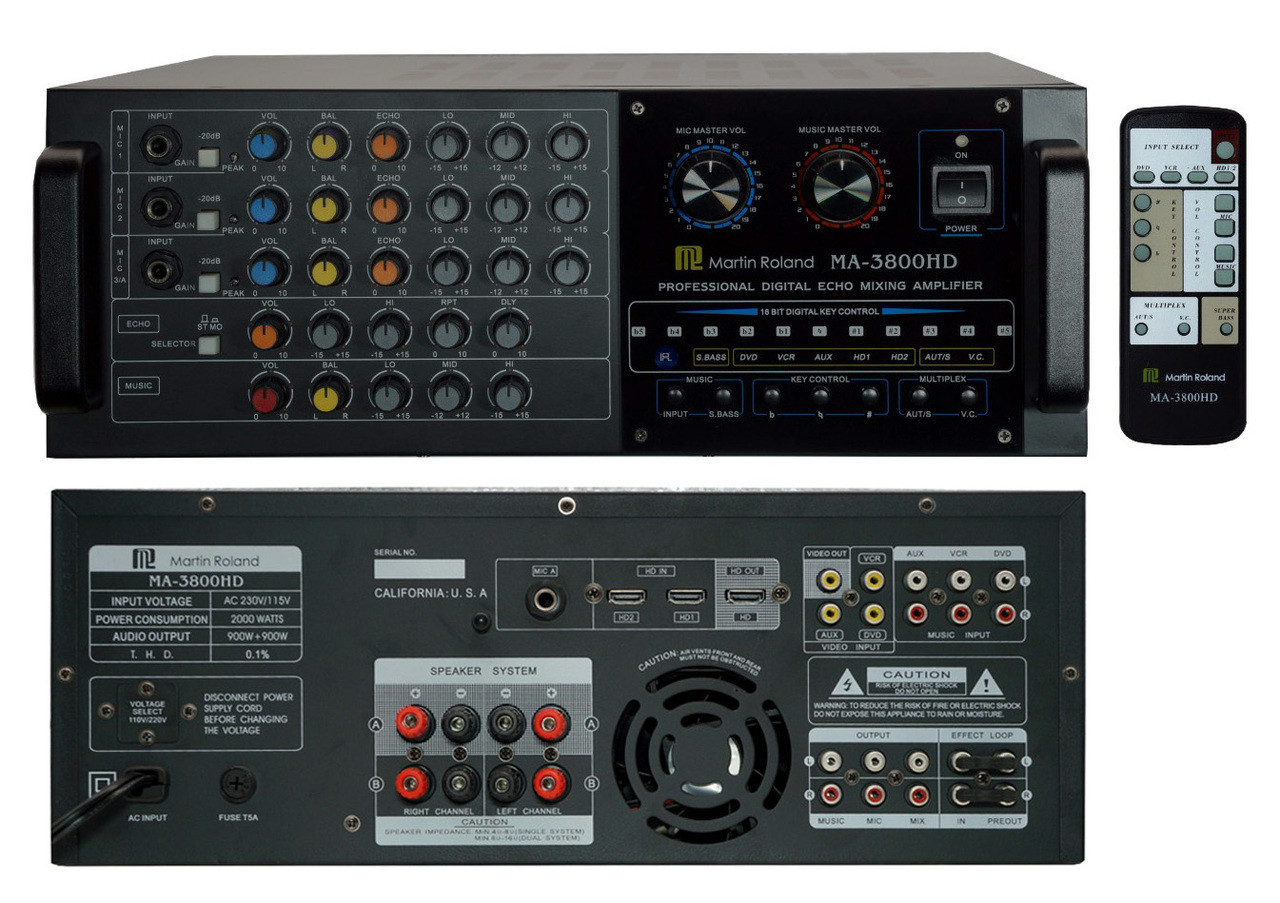The MA3800HD 1800W Digital Echo Mixing Amplifier with HDMI, High Definition output on both Video & Audio, which produces the highest and best sound quality. It also has 3 microphone inputs can be adjusted individually, and you can have the 11-steps 16Bit key control for tone change. The main output power can be remotely controlled; the music volume is controlled by remote too. I like it very much for its 3 individual inputs from 3 sources, both can be connected from audio and video, so you can switch between 3 equipments to out their video and audio by one remote, the best part is that you just need one input jack on TV for Video, it is an expansion for input from DVD, PS3 or Music System. Plus, there is a mixed output ( Music and Vocal), from this one, you can connect it with a TV input, so that no matter what source you select, you can hear it from the TV speaker.